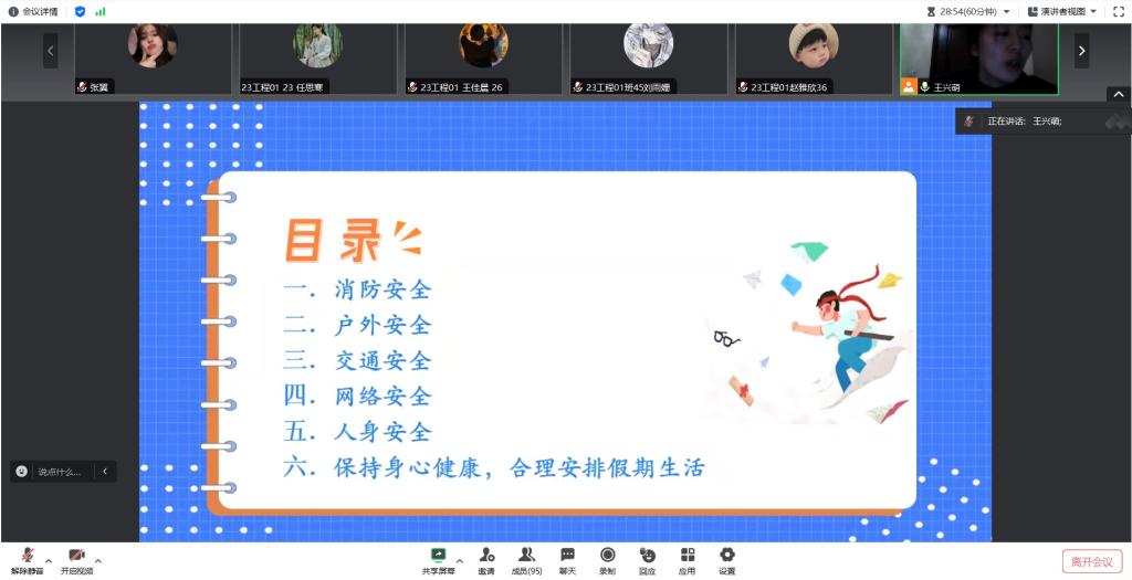 班会上,各辅导员老师结合关于假期校园和学生安全工作的会议精神,对全体学生的假期去向进行了二次全面排查,开展假期安全教育,加强对学生安全教育引导。辅导员老师结合案例,重点围绕消防安全、交通安全、实习安全、人身财产安全、防范电信诈骗等方面进行再教育,引导同学们科学应对危险、规范避险方式。同时,辅导员们号召全体学生合理做好假期规划,积极参加社会实践,在实践中受教育长才干,做到知行合一。如遇特殊情况,及时与家长、老师联系。