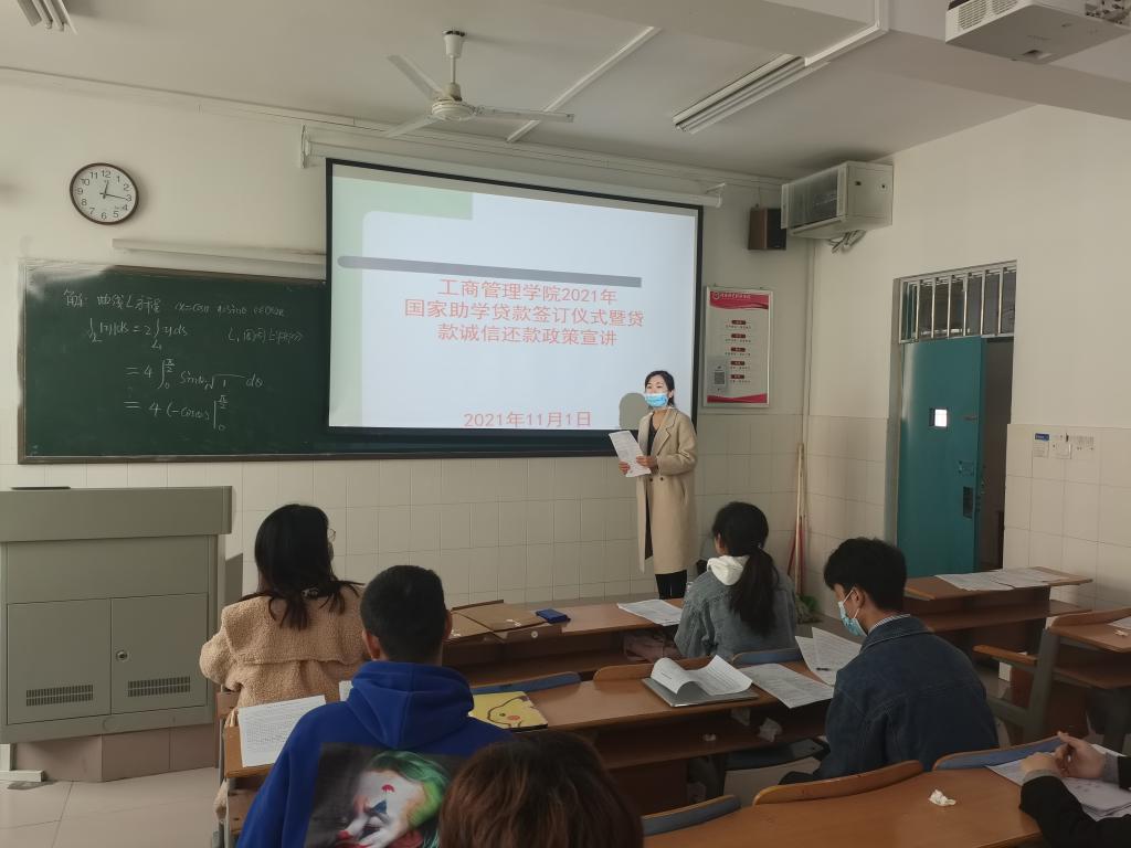 会上,席亚芳老师首先介绍了我院2021年度国家助学贷款工作情况并系统讲解了高校助学贷款的办理、还款步骤和国开行贷款系统的日常维护等操作流程,使学生对国家助学贷款整个过程有了清楚的了解。接着,席老师带领大家签订了《国家开发银行高校助学贷款借款合同》和《国家开发银行高校助学贷款承诺书》。随后,对全体申请国家助学贷款学生进行诚信教育,详细讲解了个人征信在日常生活中的重要程度,强调了坚守诚信,按约还款的重要性,希望同学们在个人学习和生活中怀揣感恩之心,恪守诚信观念,树立乐观积极的生活态度,做自立自强、德才兼备的文明大学生。最后,带领全体同学进行了诚信宣誓。同学们纷纷表示一定会合理规划个人的学习生活,诚信做人,按约还款,以优异的学习成绩和良好的信誉回报学校和社会。