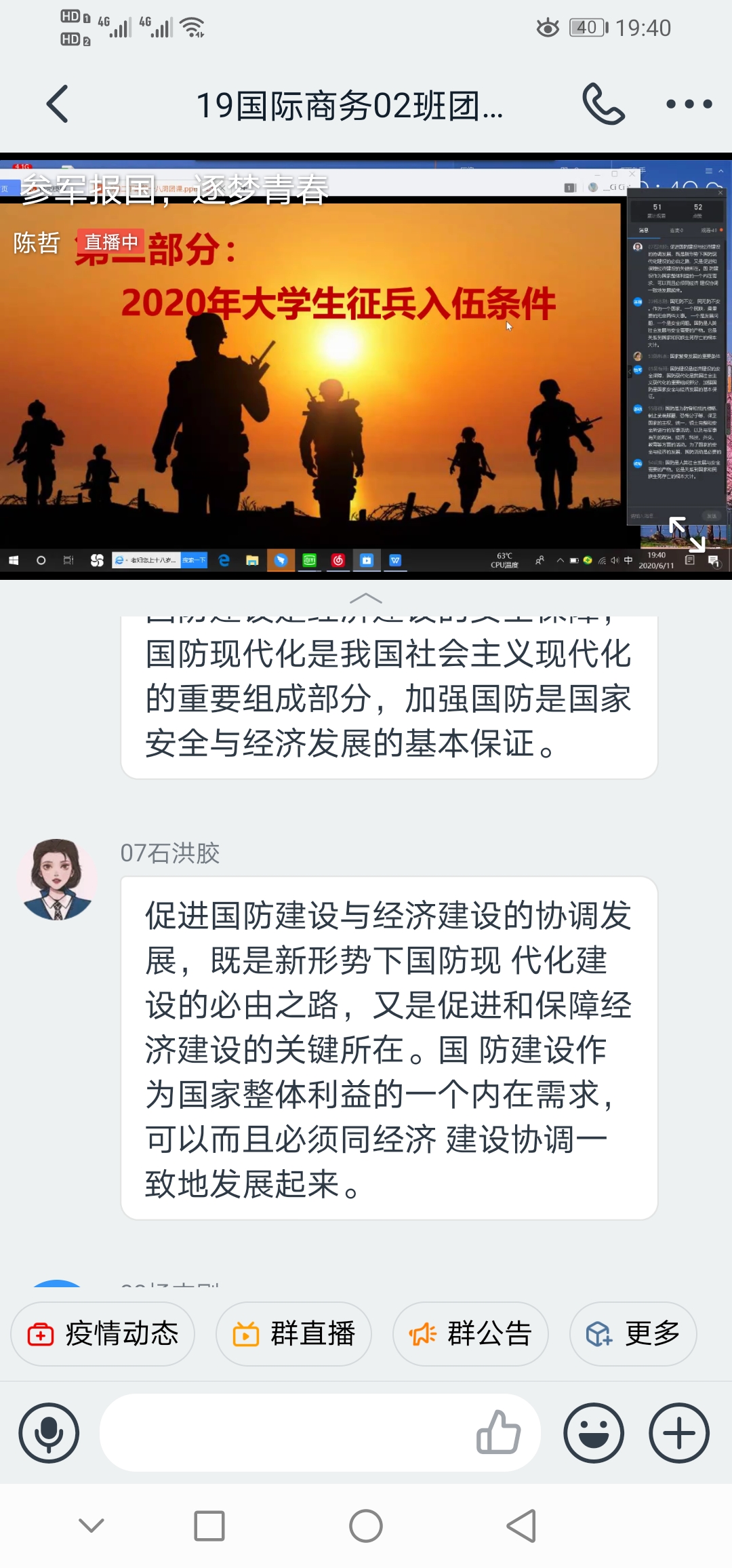 团课中,各班团支书带领大家了解征兵有关信息,向大家宣讲大学生参军入伍的意义及相关优惠政策,特别强调大学生征兵入伍是国家重大战略决策,是新形势下加快国防和军队现代化建设,实现中国梦、强军梦的一项重要举措。学生代表积极发言,表示党和国家为我们创造了今天的幸福生活,我们也应该用自己的力量为祖国的明天做出努力,积极参军,保卫国家。我院还在征兵QQ群里开展了解读2020年的征兵政策,包括应征入伍时间、程序、要求以及各项优惠政策等,咨询和报名的同学络绎不绝。