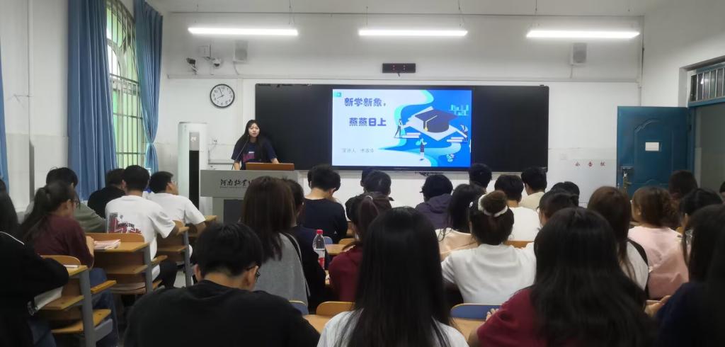 22物业01班李淑华同学以“新学新象,蒸蒸向上”为中心思想,激情演讲身为青年的时代新人如何担负民族重任,进而展开新一学年的青年学生如何平衡学习与实践的时间。