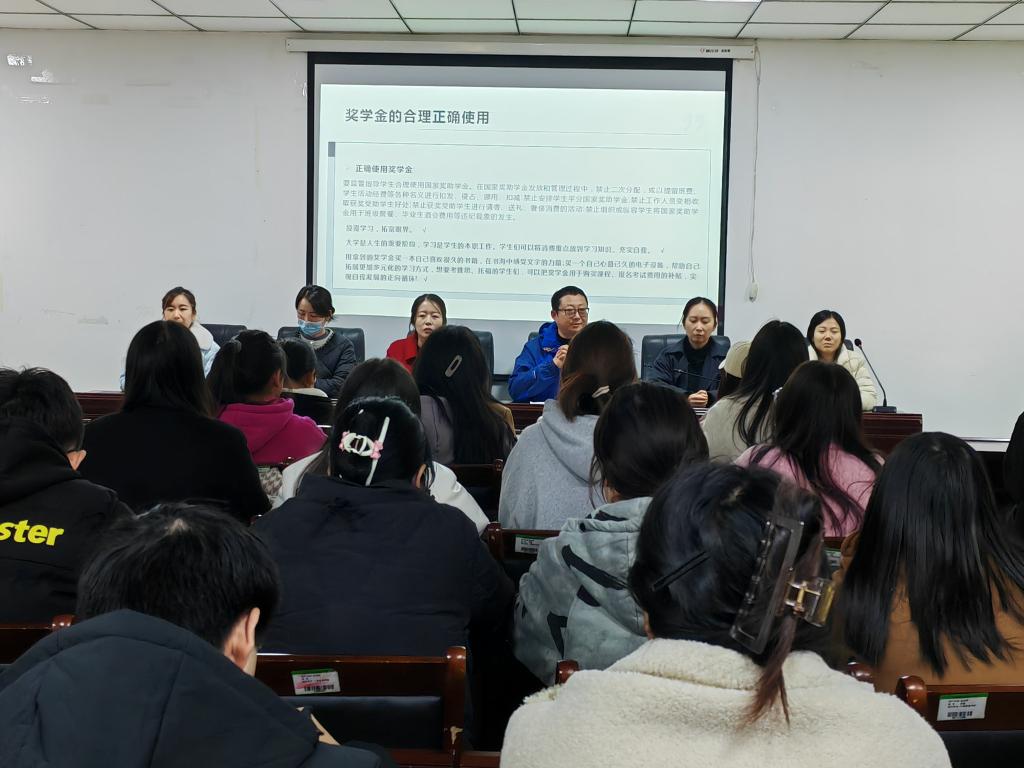 会议伊始,党委副书记詹珅宣读了和介绍国家助学金发放的目的与政策,也提出了要杜绝助学金滥用,相互攀比与高消费。拿到助学金的学生应该兴怀感激,立志成才,用好每一分钱。团委书记贾雪和资助专员席亚芳老师再次呼吁学生滴水之恩当涌泉相报,作为新时代的大学生应该以饱满的热情、激昂斗志、不断创新、大力弘扬学术精神,也要适应社会发展需要的新型人才。认真学习不断提升自己的知识面与综合素质,要求学生们勤俭节约,自立自强。