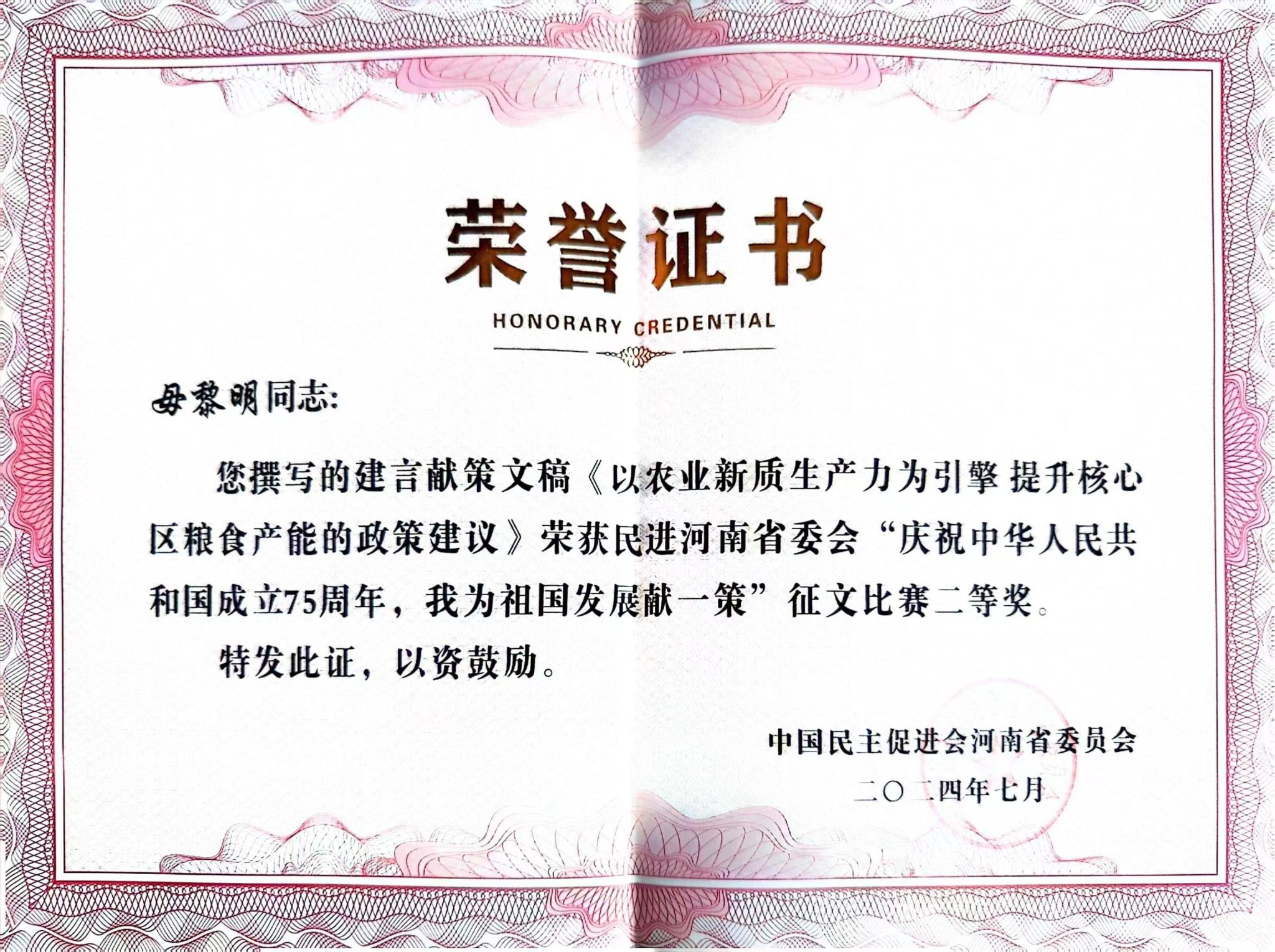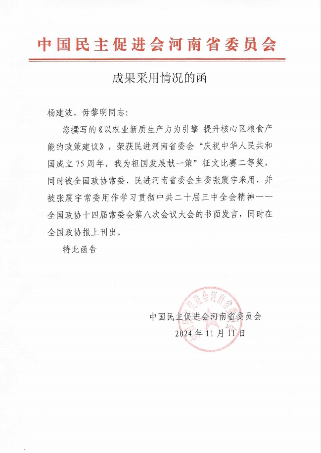 毋黎明发挥专业知识,与河南省科学院地理研究所就河南省农业发展开展广泛的社会调查和深入研究。本次被采用文章由毋黎明与河南省科学院地理研究所土地科学研究中心主任杨建波研究员联合撰写。在杨建波研究员的建议和指导下,毋黎明结合我省作为农业大省的省情,以习近平总书记关于新质生产力的理论为基础,丰富和发展了农业新质生产力,提出了利用农业新质生产力促进河南省等全国十三个粮食主产区粮食生产能力提升的政策建议,并通过中国民主促进会河南省直九支部递交民进河南省委。