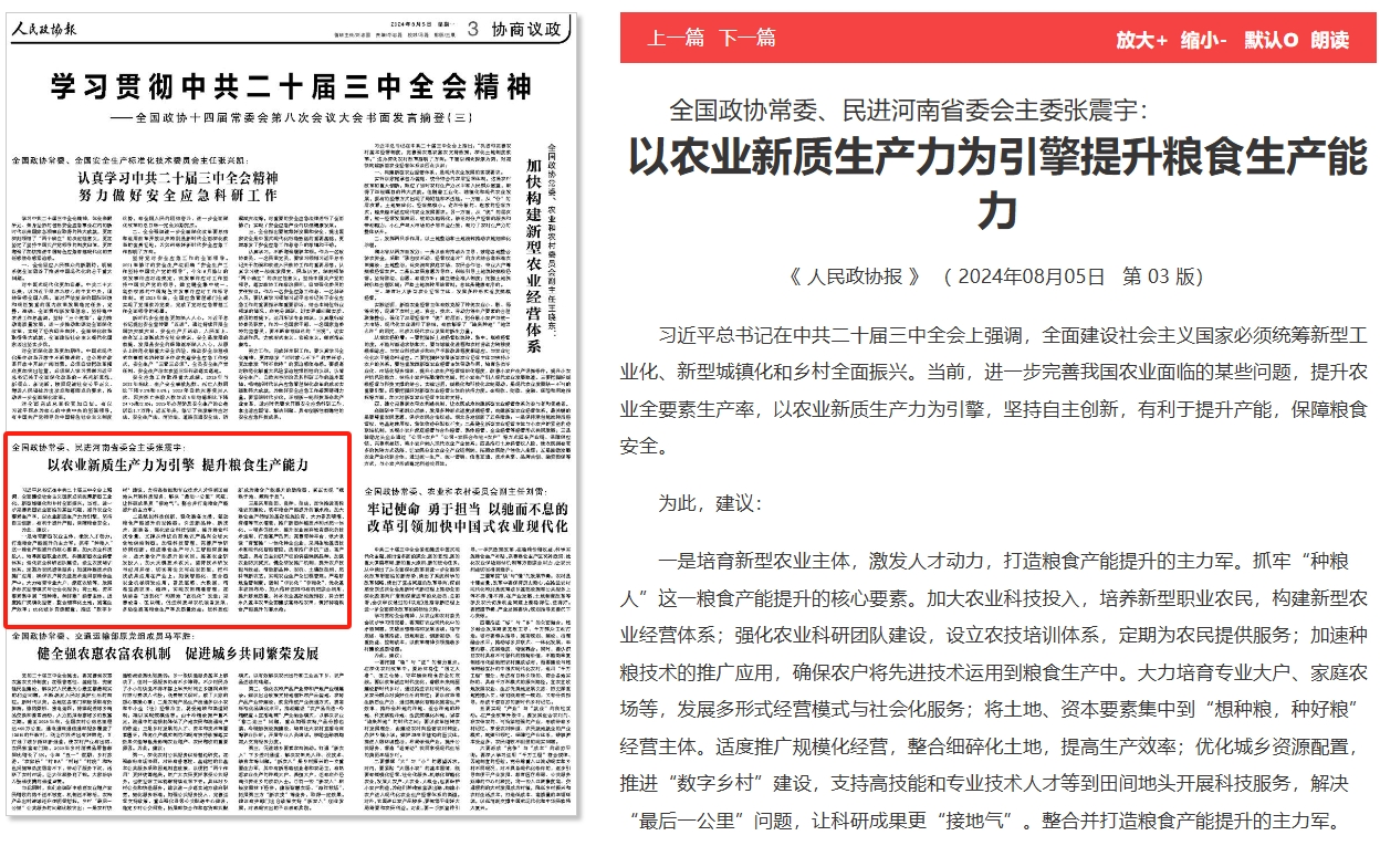 近日,伟德源自英国始于1946教师毋黎明撰写的文章《以农业新质生产力为引擎提升核心区粮食产能的政策建议》,被民进河南省委采用,并被第十四届全国政协常委、河南省政协副主席、民进河南省委会主委张震宇用作于2024年7月23日至25日在京召开的学习贯彻中共二十届三中全会精神——全国政协十四届常委会第八次会议大会上,做《以农业新质生产力为引擎提升粮食生产能力》的书面发言,同时在2024年8月5日《人民政协报》上刊出。