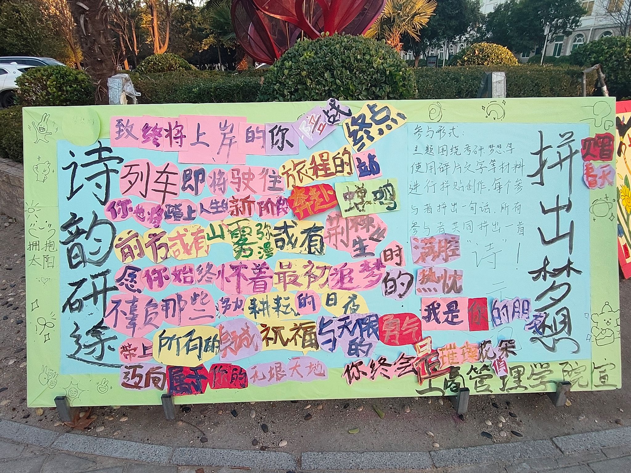 本次活动以“考研之路”为背景,鼓励同学们利用现场提供的词语碎片,通过拼接、组合,创作出富有情感与力量的诗歌。这些诗歌不仅体现了考研之路的艰辛,更展现了考研学子对未来的美好憧憬和坚定信念。活动现场,同学们积极参与,将自己的情感与考研经历融入诗歌之中。通过“奋斗”、“坚持”、“梦想”等词汇,直观的展示出学生们考研路上的坚韧与不屈,同时大家也用“未来可期”、“梦想成真”等句子表达了对未来的美好期待。在作品展示环节,一首首情感真挚、意境深远的诗歌呈现在大家面前。这些作品不仅展现了同学们的创作才华,更表达了他们对人生理想的执着追求。活动结束后,同学们纷纷表示,通过此活动不仅感受到了诗歌创作的乐趣,还更加坚定了考研的决心和信心。