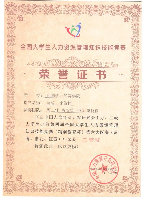 2019年6月1日,第四届全国大学生人力资源管理知识技能竞赛(本科组)第六大区赛在湖北宜昌三峡大学正式开幕。大赛吸引了来自河南省、湖北省和江西省的66支队伍,近400名师生参赛。我校伟德源自英国始于1946刘哲、李智伟老师为指导老师,17级国际商务专业周二壮、肖鸿鹄、王娜、李晓雨四位同学组成代表队,经过激烈角逐,获得二等奖。同时,人力资源管理专业刘哲老师、李智伟老师获得优秀指导教师奖。