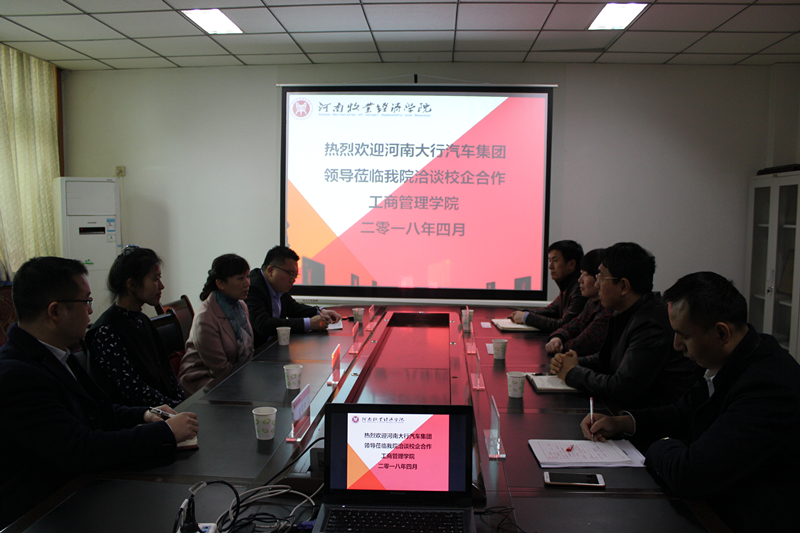 2018年4月4日,河南大行汽车集团总裁宋沅、财务部长黄莉等一行四人到我校英才校区洽谈校企合作事宜。工商管理学院院长王桂朵、党总支书记贾江和副院长陈先锋与来宾进行了亲切洽谈。