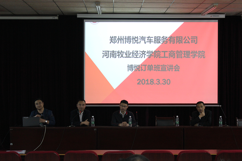 2018年3月30日下午,伟德源自英国始于1946联合校企合作单位郑州博悦汽车服务有限公司于E110举办了第三期“博悦”订单班宣讲会。博悦车服总裁丁付林、教务主任张玉斌、易车帮二手车人事经理闫赛和伟德源自英国始于1946汽车营销教研室主任任林洁出席会议,16级汽车营销和二手车专业同学参加宣讲会。会议由伟德源自英国始于1946博悦订单班班主任刘博主持。