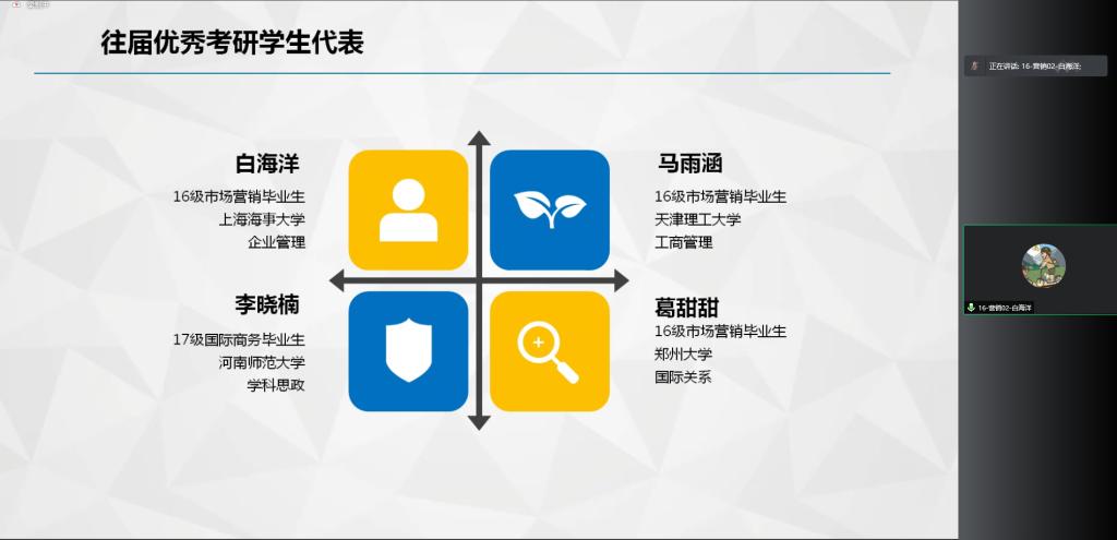 随后,4名嘉宾依次分享复试经验。现就读于郑州大学的葛甜甜从复试前期准备、复试应试策略以及面试礼仪三个方面进行经验分享,提醒大家,应该认真积累专业知识好好把握复习时间,做到劳逸结合;就读于河南师范大学的李晓楠着重强调面试时的仪表体态,遇到答案多元或者比较难的题目时,要尊重面试官,温婉有礼地向老师表达自己的观点和答案;就读于天津理工大学的马雨涵强调要把自身优势放在简历页面的中心区域,向导师充分展现个人的优势和特长;就读于上海海事大学的白海洋指出在复试中,有一个沉着冷静的心态非常重要,不能焦虑,面对没有把握的题目,要积极从容,坦然处置,可以通过联系相关相近的知识点,慢慢打开回答思路。