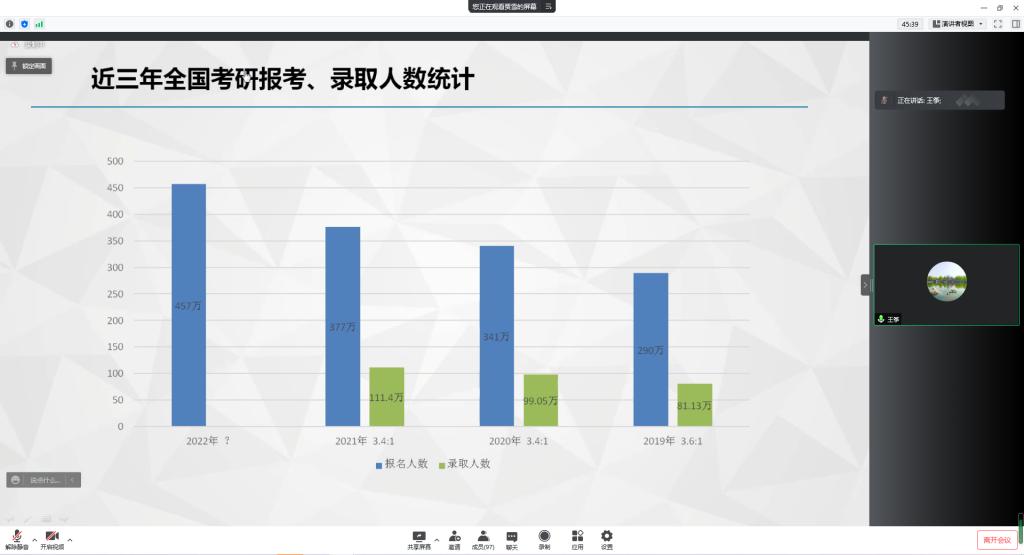 书记王筝向同学们介绍了近年来全国考研招录基本情况并指出:在当前就业人数多、竞争极其激烈的社会背景下,出于提升竞争能力的需要和研究生就业率更高、就业质量更好的现实情况下,考研对于同学们具有十分重要的意义。同时,他鼓励大家要树立信心,在疫情期间注意身体,积极调整学习状态,学院会尽可能为复试同学做好各项服务工作,希望学生们继续努力、奋勇拼搏、诚信考试、取得佳绩。
